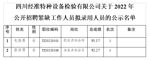 四川经准特种设备检验有限公司关于2022年公开招聘紧缺工作人员 拟录用人员的公示