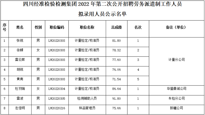 根据四川经准检验检测集团关于公开招聘劳务派遣制工作人员公告及相关管理制度,经过考试、体检、政审等公开招聘程序,现将拟录用人员名单(附后)予以公示,公示期限为5天(2022年7月22日至2022年7月26日)。公示期间,干部群众如有情况需要反映,请以真实姓名向公司纪委书面或电话反映。