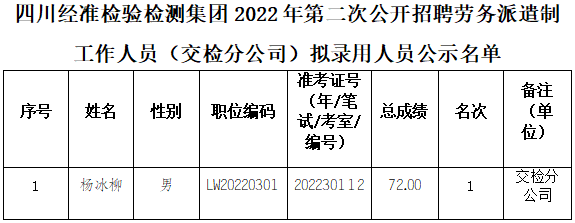 根据四川经准检验检测集团关于公开招聘劳务派遣制工作人员公告及相关管理制度,经过考试、体检、政审等公开招聘程序,现将拟录用人员名单(附后)予以公示,公示期限为5天(2022年8月20日至2022年8月26日)。公示期间,干部群众如有情况需要反映,请以真实姓名向公司纪委书面或电话反映。