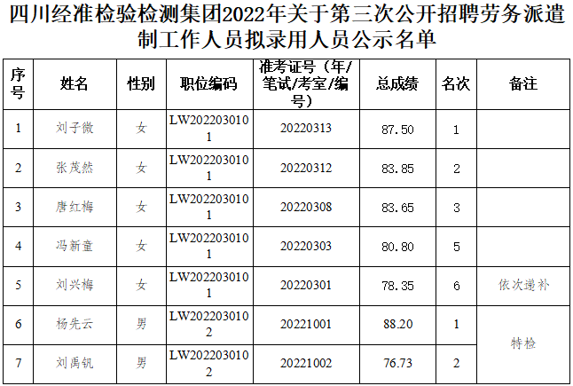 根据四川经准检验检测集团关于公开招聘劳务派遣制工作人员公告及相关管理制度,经过考试、体检、政审等公开招聘程序,现将拟录用人员名单(附后)予以公示,公示期限为7天(2022年11月5日至2022年11月11日)。公示期间,干部群众如有情况需要反映,请以真实姓名向公司纪委书面或电话反映。
