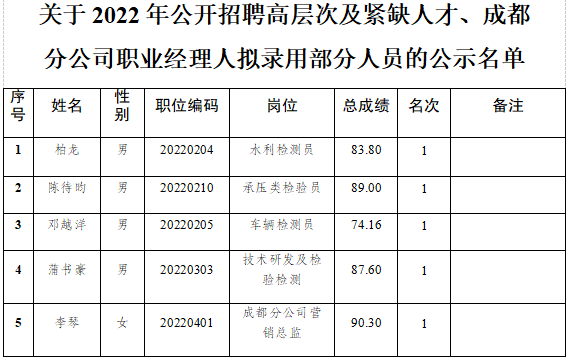 根据四川经准检验检测集团股份有限公司关于公开招聘高层次及紧缺人才、成都分公司职业经理人公告及相关管理制度,经过考试、体检、政审等公开招聘程序,现将拟录用人员名单(附后)予以公示,公示期限为7天(2022年11月12日至2022年11月18日)。公示期间,干部群众如有情况需要反映,请以真实姓名向公司纪委书面或电话反映。