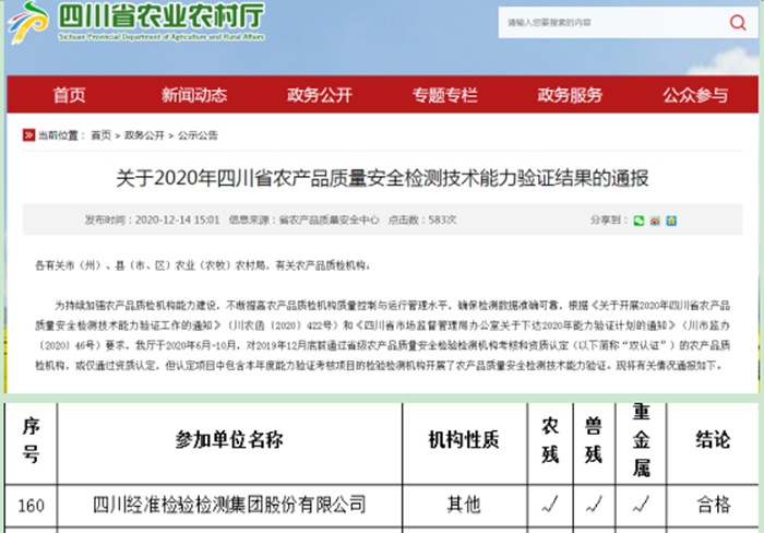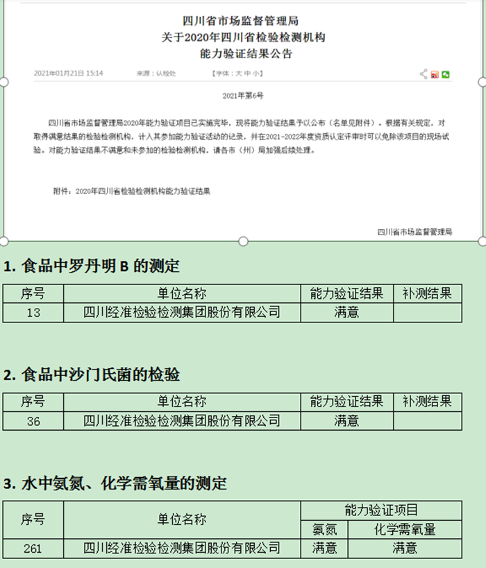 近日,质检分公司陆续收到2020年度参与的四川省市场监督管理局及四川省农业农村厅组织的能力验证结果。根据已发布的公告表明:质检分公司参加的氨氮、化学需氧量、罗丹明B等涉及食品(含农产品)、环境检测能力,共计11项参数的能力验证均获得满意结果。截止到目前,质检分公司2020年度参加的所有国家级、省级检验检测机构能力验证结果均为满意!