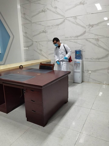 图为正在进行办公区域消毒