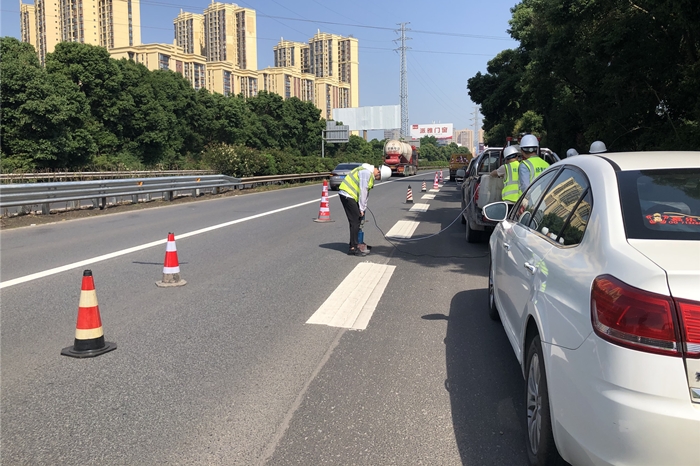 本次检测工作涉及了路面构造深度、厚度、渗水系数,标线厚度、光度性能等检测参数,为确保试验检测工作有序开展及工地现场的安全,该检测项目负责人拟定了详细的工作计划,召开了工作安排专题会议,并在检测前进行了班前安全讲话和技术交底,本次检测公司质量技术安全部派专员对检测现场安全防护工作进行了监督检查。