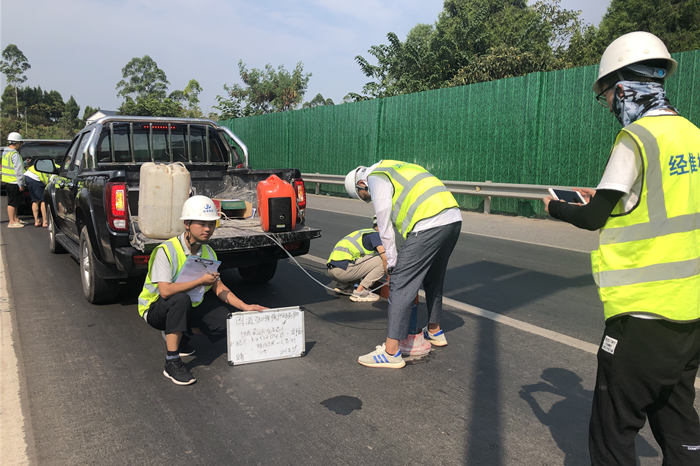 在检测现场,交检公司检测人员熟练的操控仪器,对道路现场进行检测,顺利完成了各项检测工作任务,为以后在炎热天气条件下开展项目综合型、人员团体性的现场检测工作做出了先例和良好的示范作用。