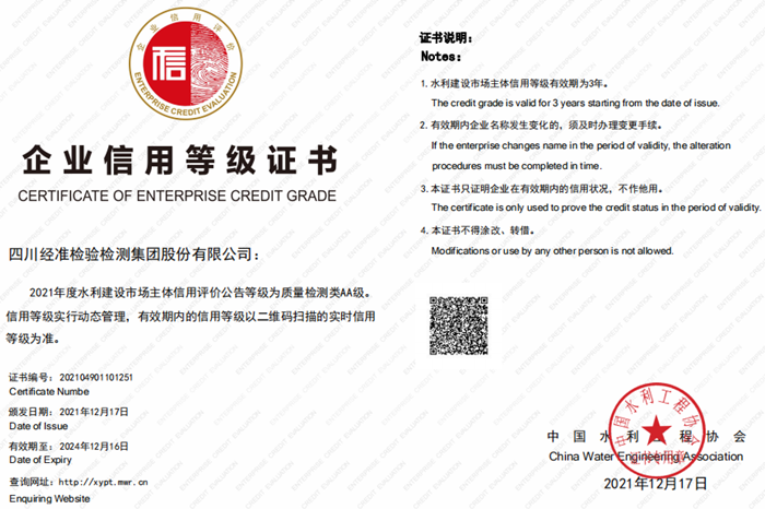 近日,四川经准检验检测集团股份有限公司在水利部2021年水利建设市场主体信用评价中获得了“AA”信用良好等级。