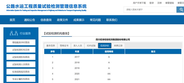 经准集团交检分公司严格按照四川省交通工程质量监督站《关于做好2021年度公路水运试验检测信用评价工作有关事项的通知》、交通运输部《公路水运工程试验检测信用评价办法》相关要求,遵循“科学、客观、严谨、公正”的原则,依据“公司管理体系”独立开展检测工作。通过本机构(参建项目)自评、建设单位及行业主管部门的综合评价,四川经准检验检测集团股份有限公司在2021年度再一次获得了“AA级”信用评价,为创优经准品牌、加快集团公司检验检测事业稳步发展奠定了坚实的基础。