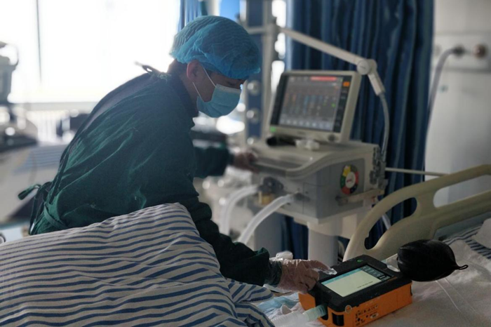 图为检测人员正在ICU校准呼吸机