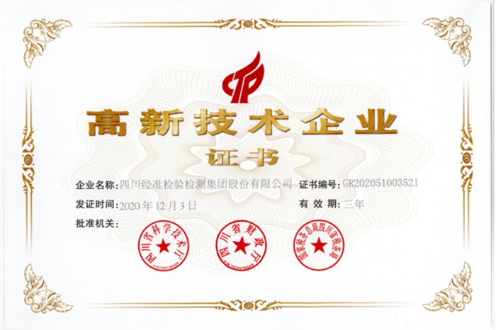 四川经准检验检测集团股份有限公司于2020年12月顺利通过了由四川省高新技术企业认定管理机构组织的高新技术企业认定,并于近期取得了高新技术企业证书,证书编号为GR202051003521。