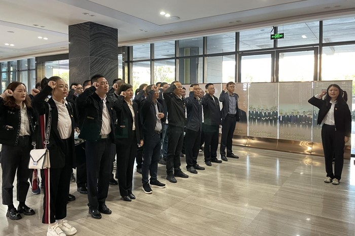 初心永存,使命必行。全体人员面向鲜艳的党旗肃立,举起右手紧握拳头,铿锵有力地宣读入党誓词。铮铮誓言,声声震耳,党员们重温入党时的初心,也再次表达了对党的忠诚和为党的事业奋斗终身的坚定决心。