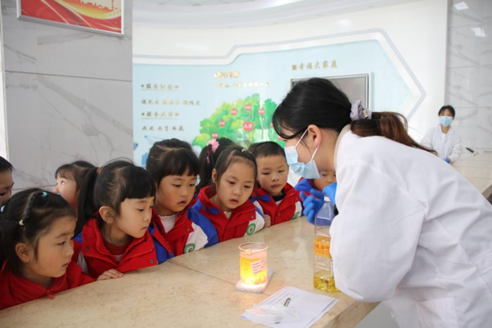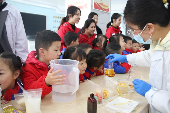 工作人员通过演示兴趣实验,形象生动地让小朋友了解食品添加剂、食品酸碱性等知识,并耐心细致地为他们讲解饮食注意事项。