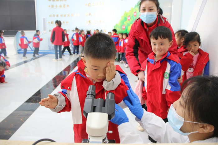 工作人员组织小朋友们使用显微镜观察螨虫,为他们讲解螨虫的危害及防治方法,进一步提升他们的防护意识和防护能力。