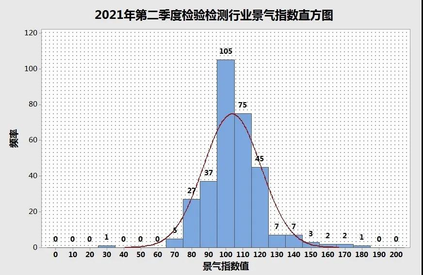 2021年第三季度检验检测行业预期景气指数达到,处于历史第三高水平。从直方图分布来看,频数峰值来到100-110之间,表明整体机构的乐观情绪决定预测值的提升。大多数机构处于上升通道内。目前看来,2021年的前两个季度,检验检测行业发展稳健,积蓄力量。是否能在第三季度保持高度景气?是否能够在行业高质量发展上面有所突破?或者是否能通过一些大型机构的并购或组建打破区域甚至整个检验检测市场的整体运行态势,值得行业从业人员关注。