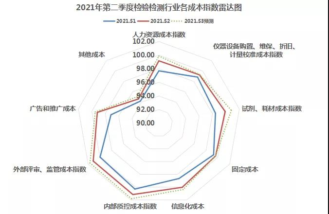 2021年第二季度处于年中,作为机构成本占比较大的三项:固定成本、仪器设备成本以及人力资源成本均相对压力较小。因此带动整体成本指数略有上升,2021年第二季度,检验检测行业成本指数值为,。