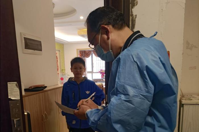 图为经准党员志愿者上门排查核酸检测情况
